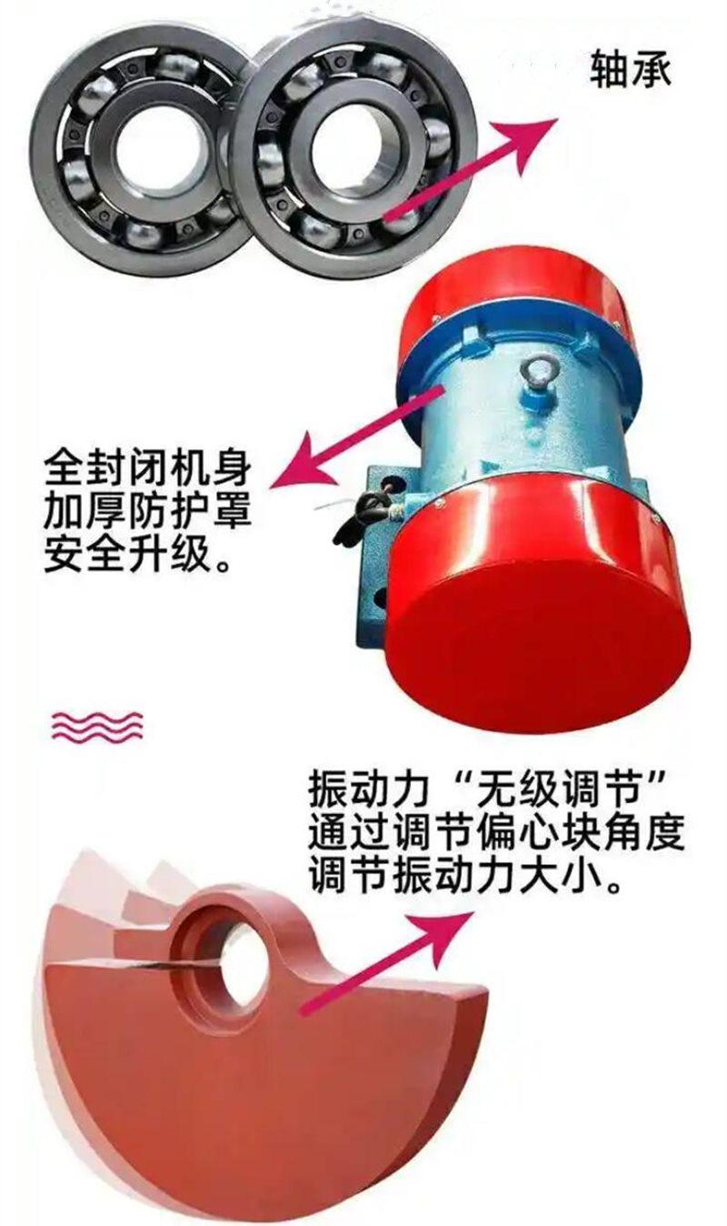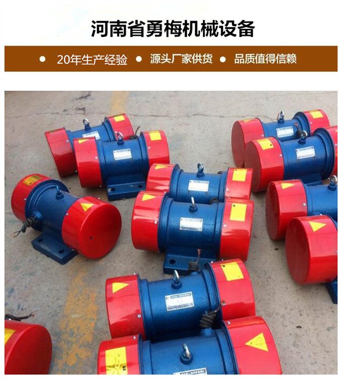 三相異步振動電機可通過調整轉速大范圍調整振動頻率,17719958219 并能任意選擇振動頻率和振幅。激振動力與功率配合得當,機體重量輕、體積小、機械噪音低。勇梅機械振動電機主要由定子、轉子、端蓋、軸承等部件組成。在轉子軸兩端各安裝一組可調偏心塊,利用軸及偏心塊高速旋轉產生的離心力得到激振力。定子繞組通常有 6 根引出線,可選擇星形聯結或三角形聯結。轉子結構分為籠式和繞線式兩種,籠式轉子結構簡單、運行可靠,應用廣泛;繞線式轉子可通過外部變阻器改善起動性能和調節轉速。
